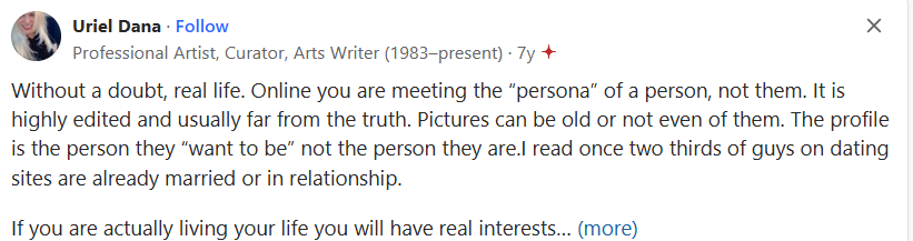 “Online, you are meeting the 'persona' of a person, not them. It is highly edited and usually far from the truth. Pictures can be old or not even of them. The profile is the person they want to be, not the person they are. I read once that two-thirds of guys on dating sites are already married or in a relationship.”
