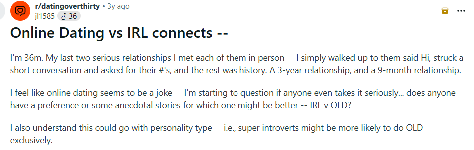 “I feel like online dating seems to be a joke -- I'm starting to question if anyone even takes it seriously... does anyone have a preference or some anecdotal stories for which one might be better -- IRL v OLD?”