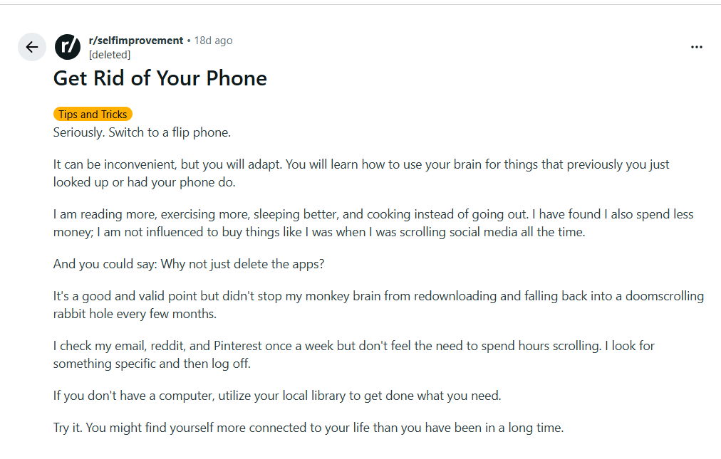 This person shares that, at first, it felt inconvenient. He couldn’t Google everything instantly. He couldn’t scroll when bored. But slowly, his brain adjusted.