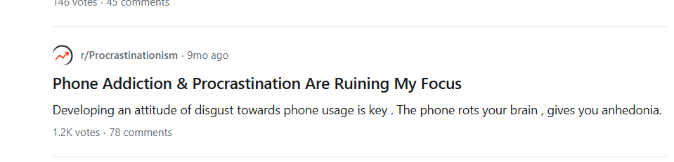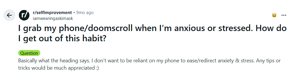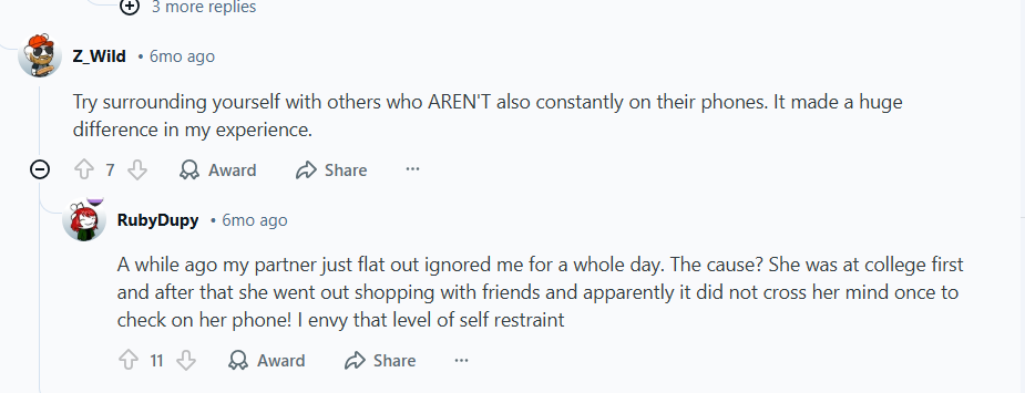 So the problem isn't just what you’re doing on your phone, it’s what your phone is replacing. On Reddit, people are anxious about similar issues.